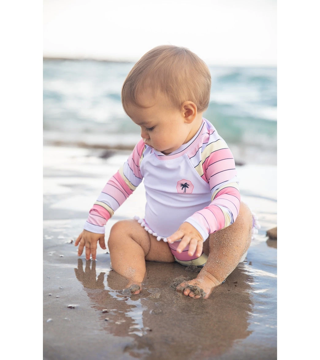The Feather 4 Arrow Girls’ Surf Babe Long Sleeve Ruffle Two Piece Swim Set (Baby) features a skirted bottom with pom poms makes this super cute and easy to wear.