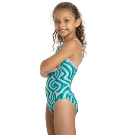 Test out the waves in this tank-style bathing suit. The Tidepools Girls Topsy Turvy Basic Tank One Piece Swimsuit comes in a fun, dazzling print. Its cute cross-back style produces a teardrop-shaped opening for extra adorableness.